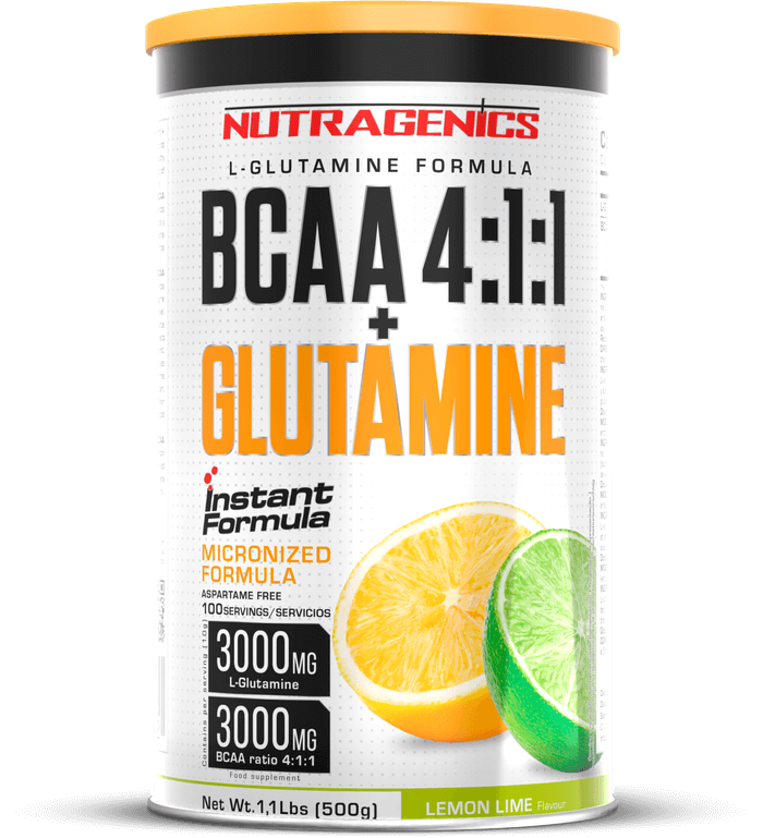 Lemon lime: L-Glutamine, BCAA's 4:1:1 [branched chain amino acids (L-leucine, L-isoleucine, L-valine)], maltodextrin, acidity regulator (citric acid), aromas, sweeteners (sucralose and acesulfame K), dye (carminic acid and patent blue V). May contain traces of milk, gluten, soy, eggs and crustaceans.