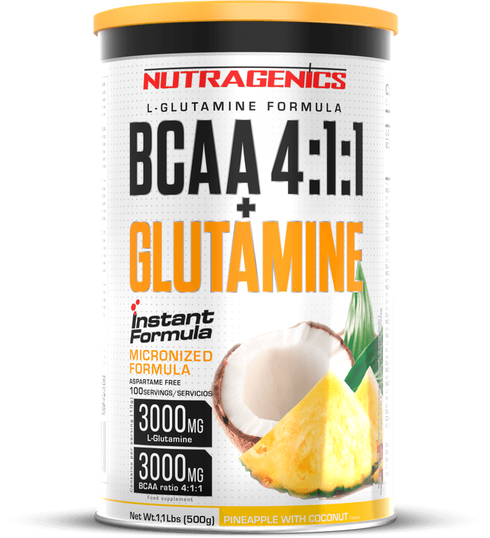 Pineapple and coconut: L-Glutamine, BCAA's 4:1:1 [branched chain amino acids (L-leucine, L-isoleucine, L-valine)], maltodextrin, acidity regulator (citric acid), aromas, sweeteners (sucralose and acesulfame K), dye (tartrazine). May contain traces of milk, gluten, soy, eggs and crustaceans.